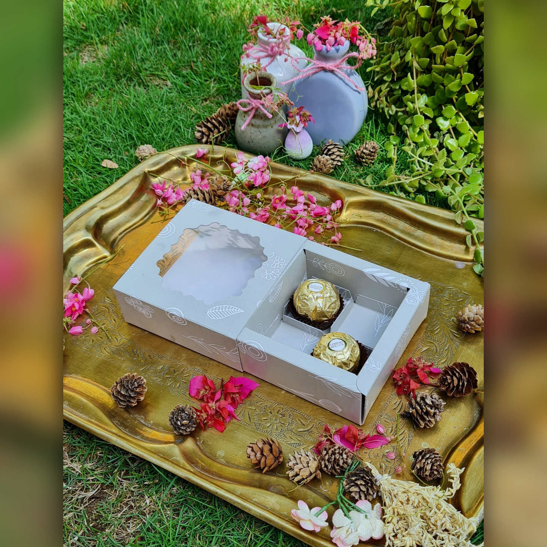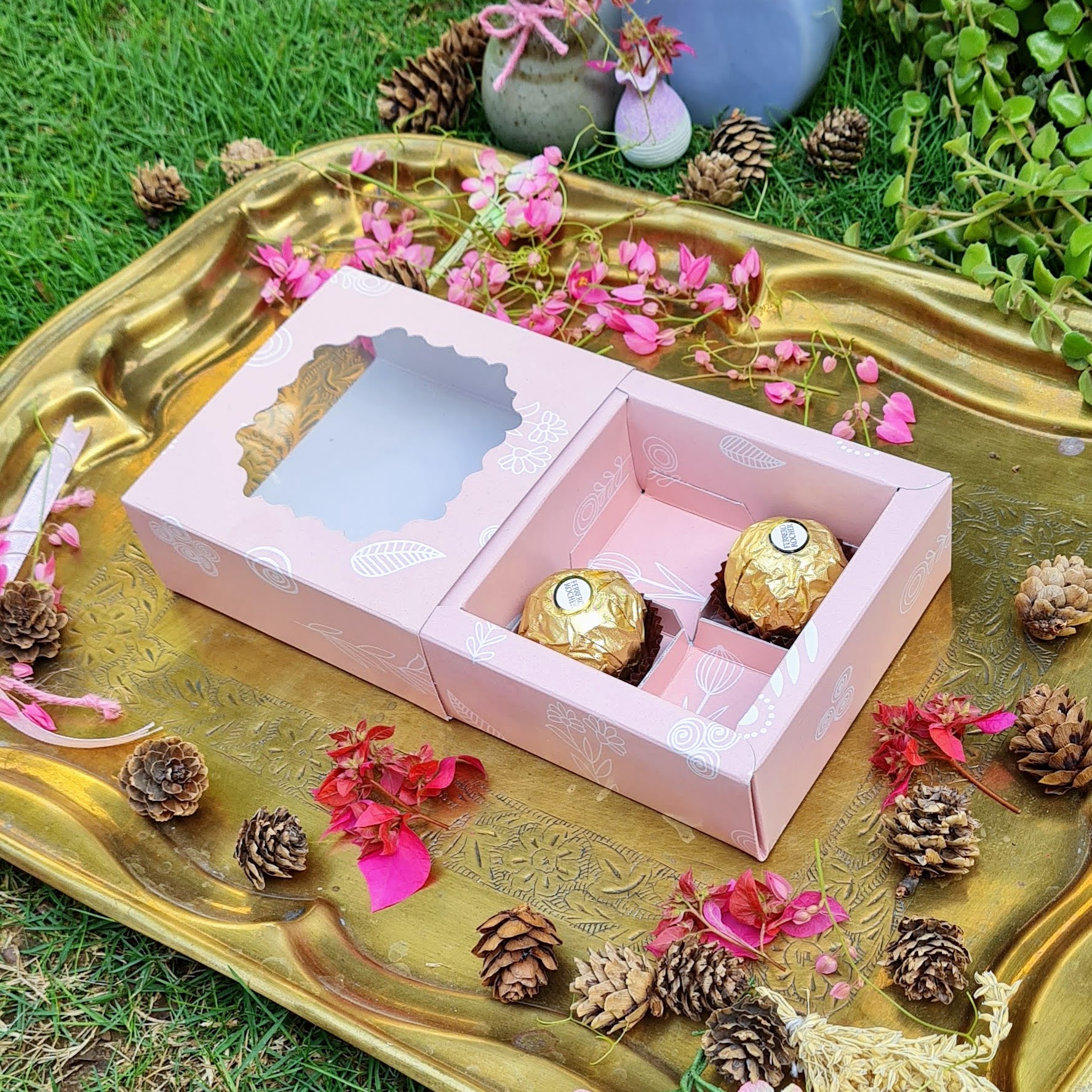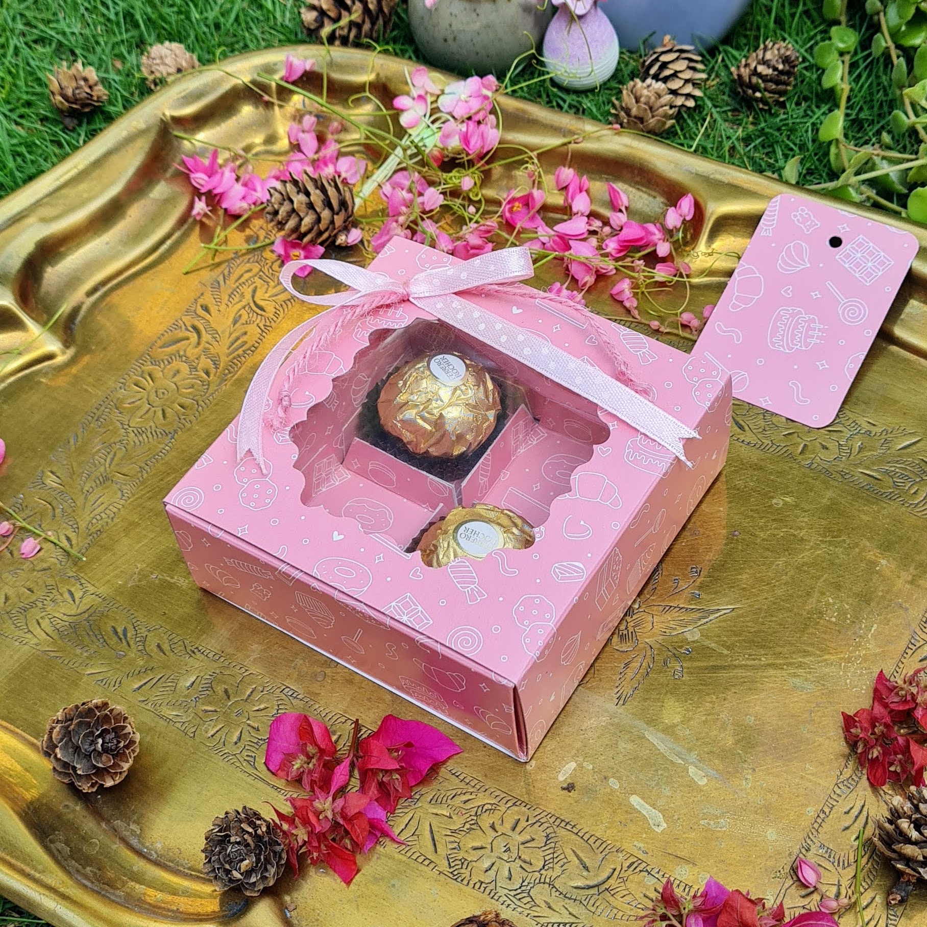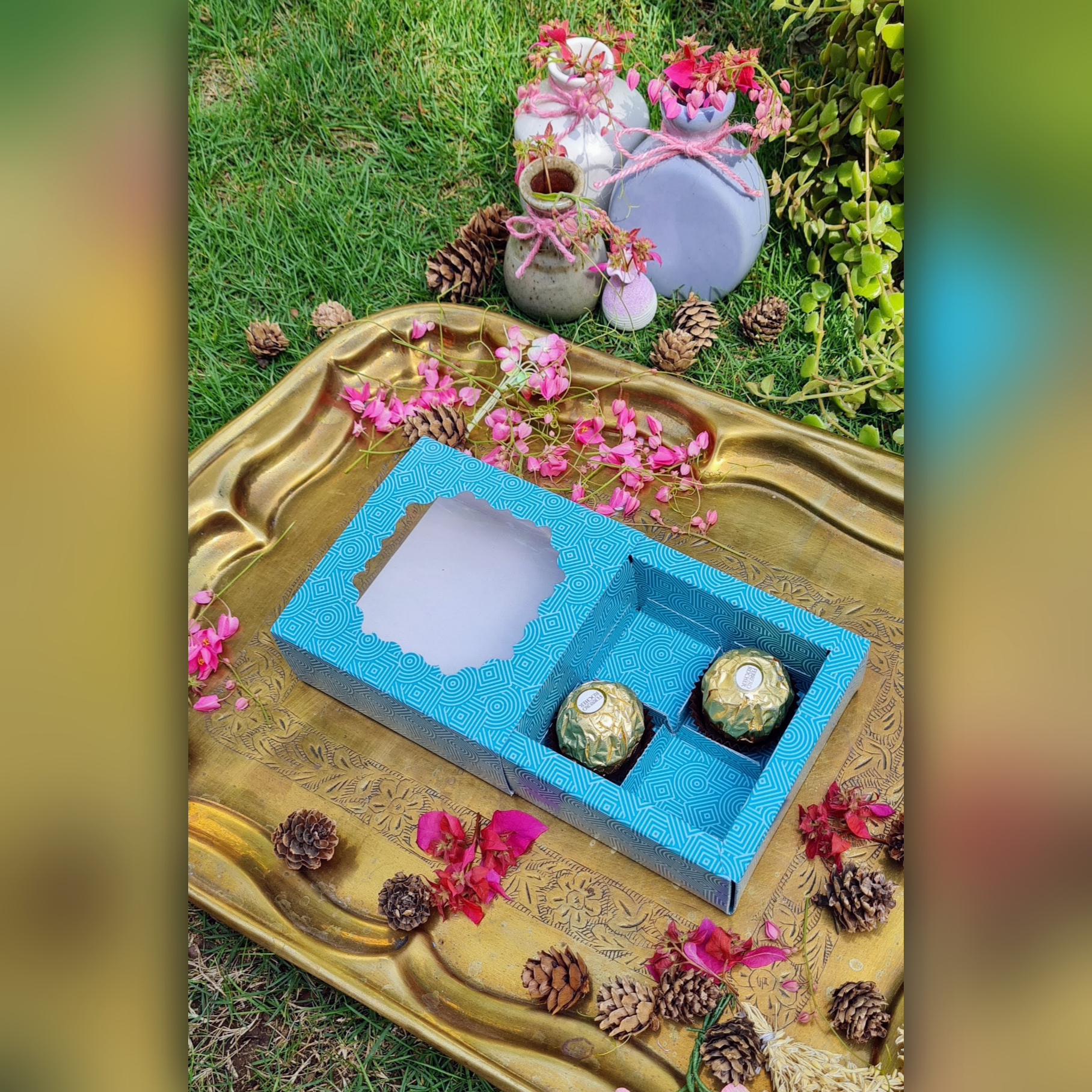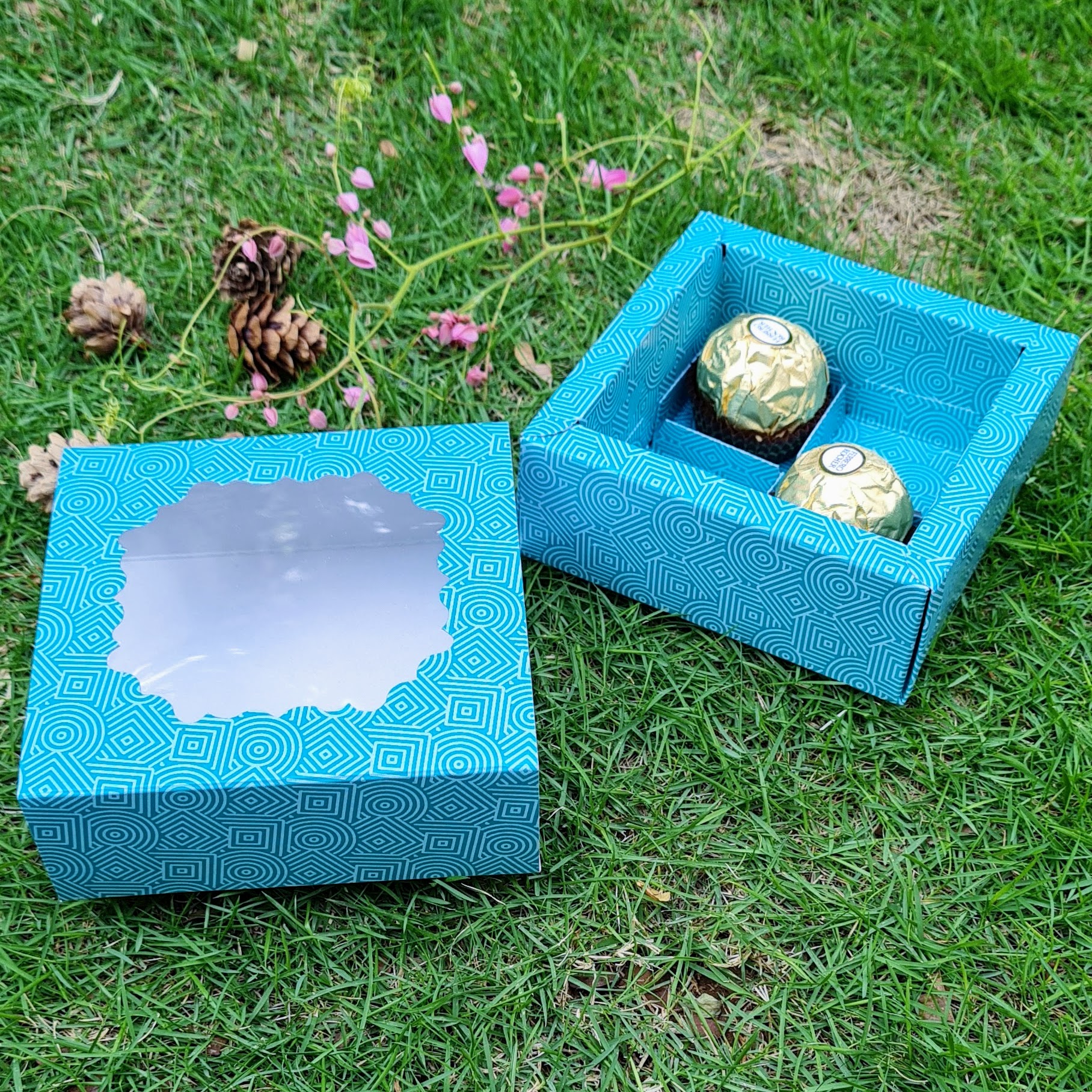 This image showcases a variety of 4-cavity boxes designed for holding both candles and sweets, making them perfect for gifting. The boxes come in a range of colors, including red, pink, gray, turquoise, and light pink, each featuring a unique pattern or design. The boxes have a transparent window on top, allowing the contents—candles or sweets like Ferrero Rocher—to be visible. The assortment is displayed on a lush green grass background, with additional decorative elements like flowers and a glass cloche filled with more sweets in the background. The overall presentation is vibrant and festive, ideal for special occasions or celebrations.