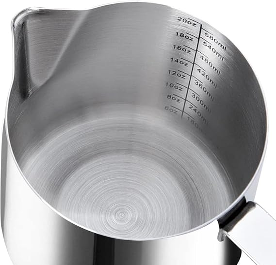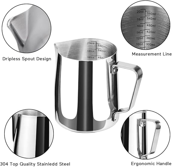 - The simple design and dripless spout mean no mess and perfect latte art. Easy to grip and pour, you won’t feel soured hands when doing much latte job. With a heat-resistant handle, the frothing pitcher is very safe and comfortable for every use, worry-free.